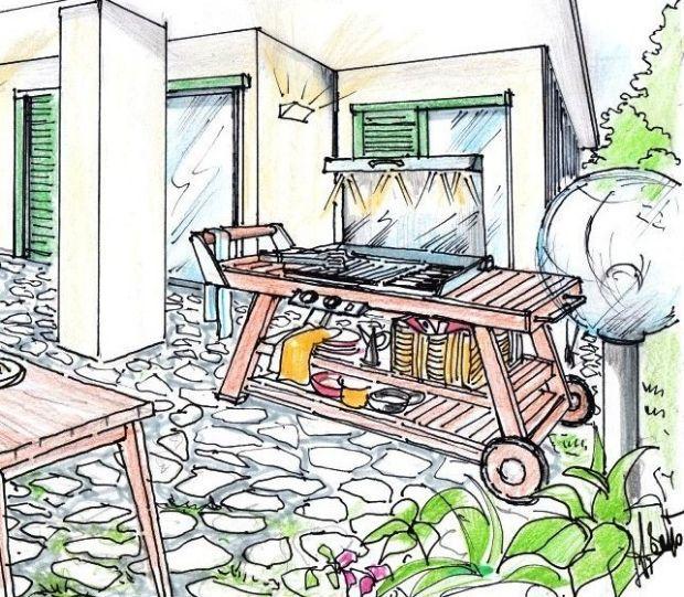 Progetto su disegno a mano libera per una zona barbecue da giardino. Il contesto è quello di una villetta di campagna, di candida ed essenziale costruzione geometrica, immersa tra boschi e prati fioriti.